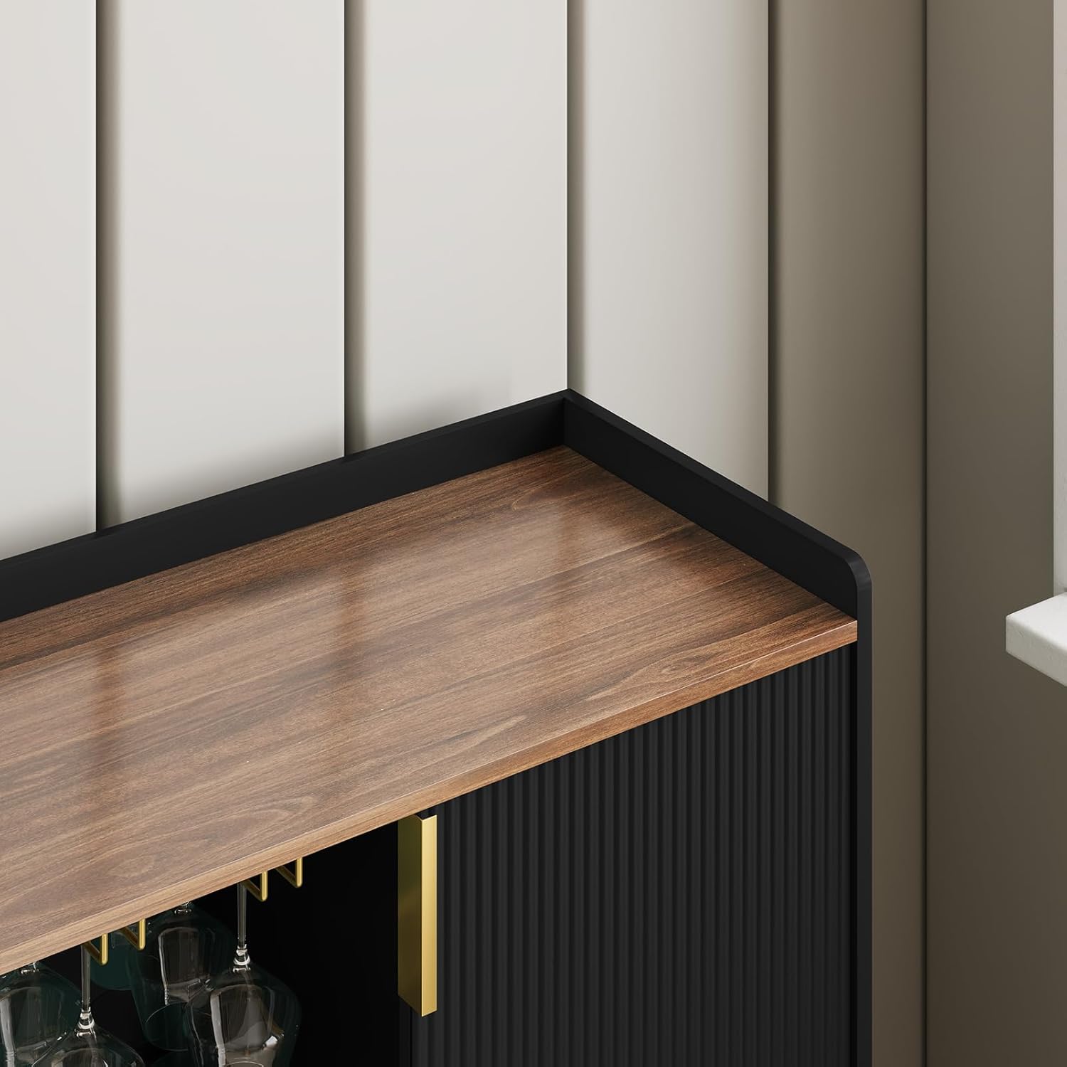 - 【Timeless Design, Contemporary Flair】 The coffee bar cabinet features gently fluted panels and softly curved silhouettes that blend mid-modern warmth with Deco-inspired elegance. Smooth curved edges contribute to a sleek silhouette while enhancing safety—especially in households with children. Warm fluted grain, gold handles, and tapered legs create a look that’s upscale and inviting.