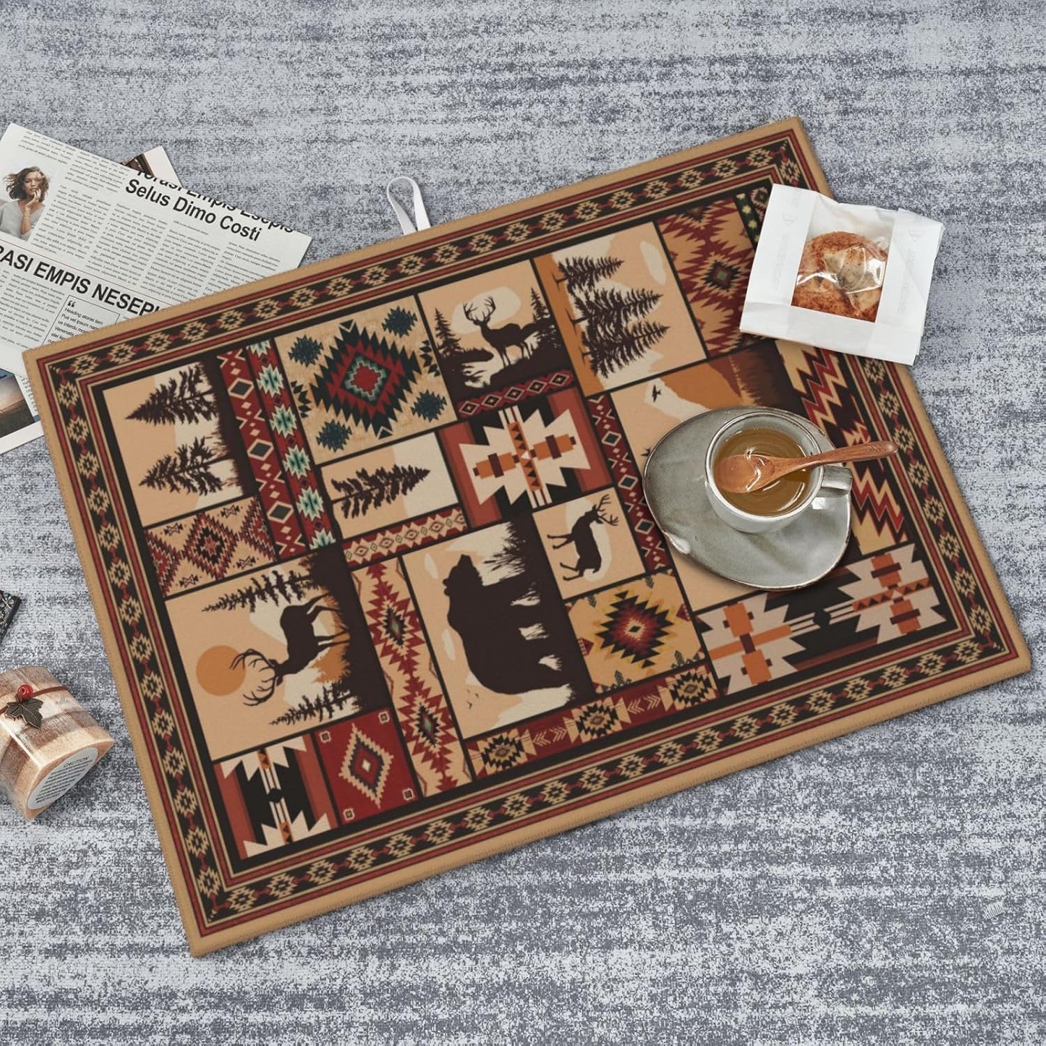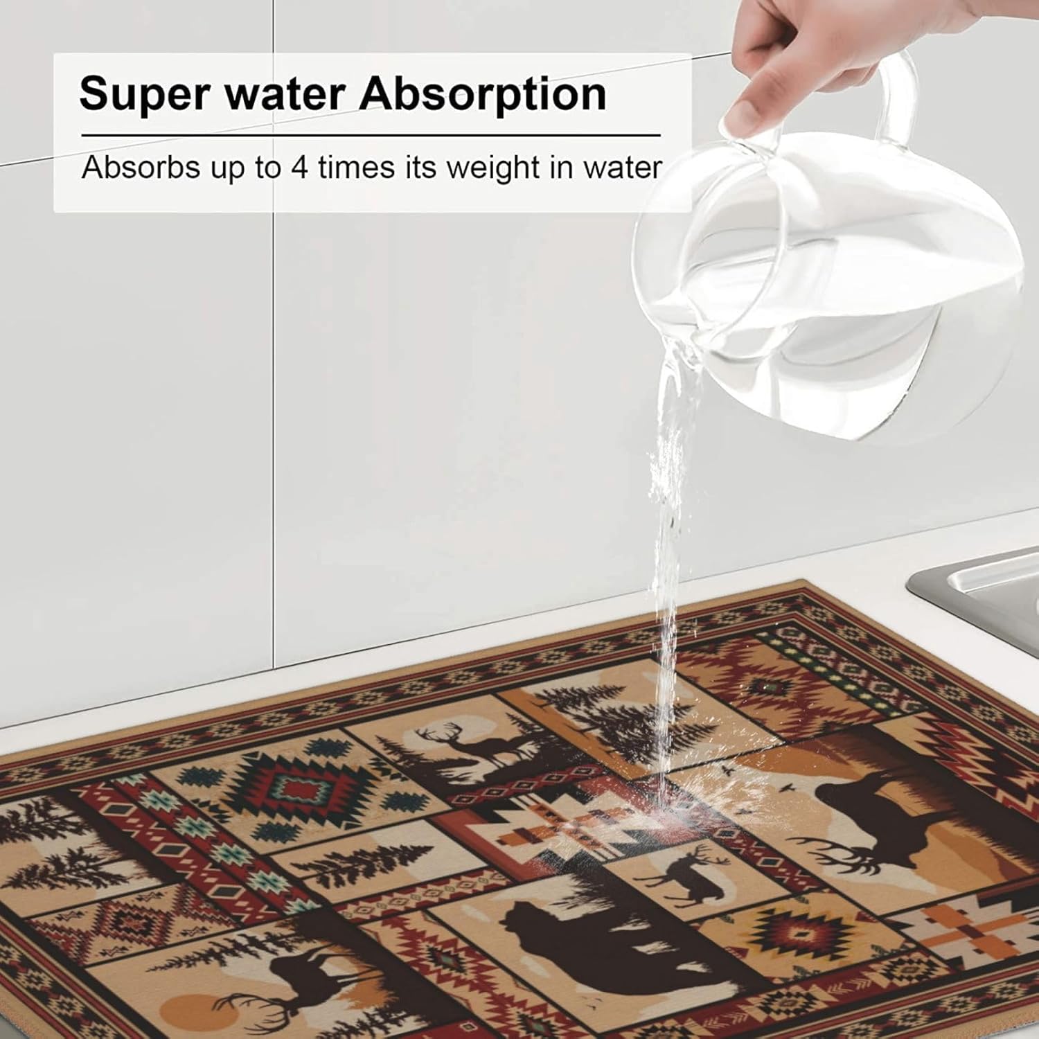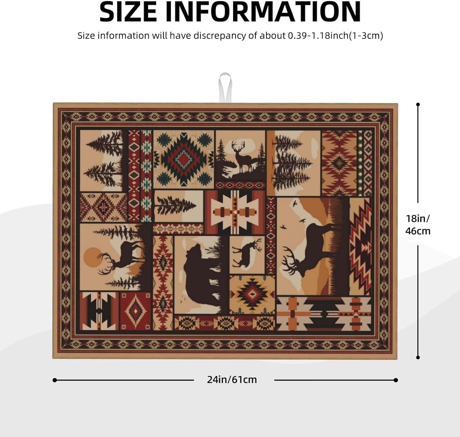 - Unique Design Style: Stand out with this retro decorative drying mat featuring a rustic western pattern with wildlife like deer, bear, and geometric motifs. It’s not just an absorbent drying mat but also a stylish kitchen counter mat that adds a touch of rustic outdoor charm to your kitchen decor, perfect as a countertop drying mat with western flair. The reverse side is pure gray, and there's a hanging loop for easy storage, combining functionality with a distinctive design