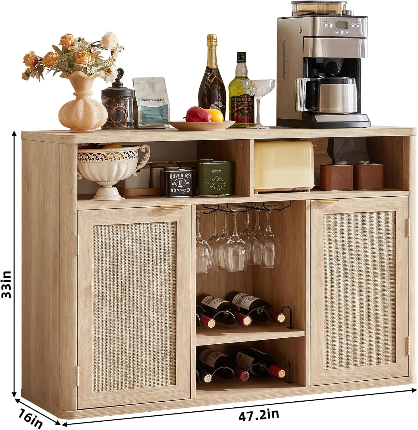 - [Stylish Rattan Mesh Doors]: The natural wood wine bar cabinet features decorative rattan mesh doors that add texture and character to your home. This thoughtful design brings a light, airy feel, making it suitable as a coffee bar cabinet in the kitchen, a whiskey cabinet for gatherings, or even a farmhouse buffet cabinet in the dining room.