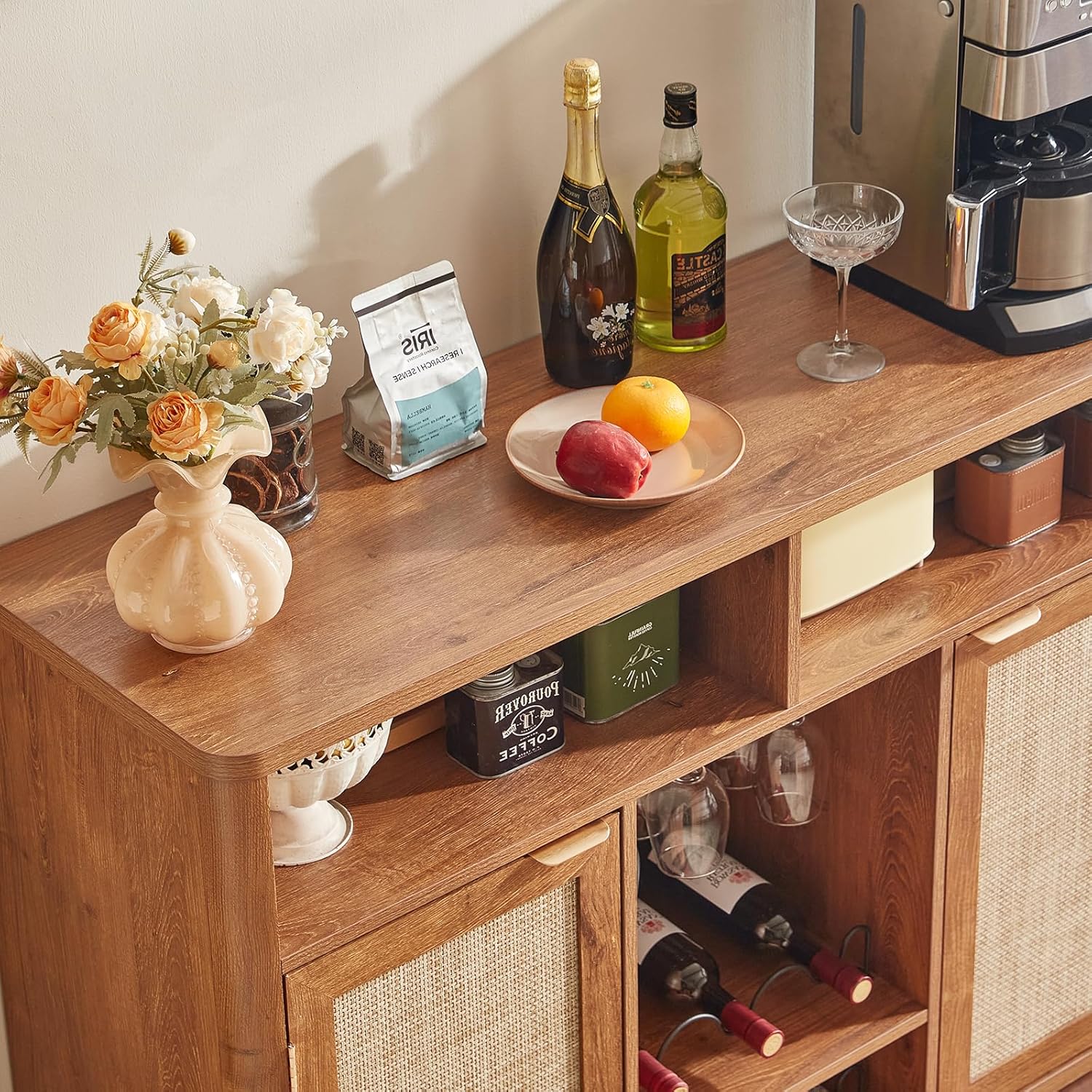 - [Stylish Rattan Mesh Doors]: The tea brown wine bar cabinet features decorative rattan mesh doors that add texture and character to your home. This thoughtful design brings a light, airy feel, making it suitable as a coffee bar cabinet in the kitchen, a whiskey cabinet for gatherings, or even a farmhouse buffet cabinet in the dining room.