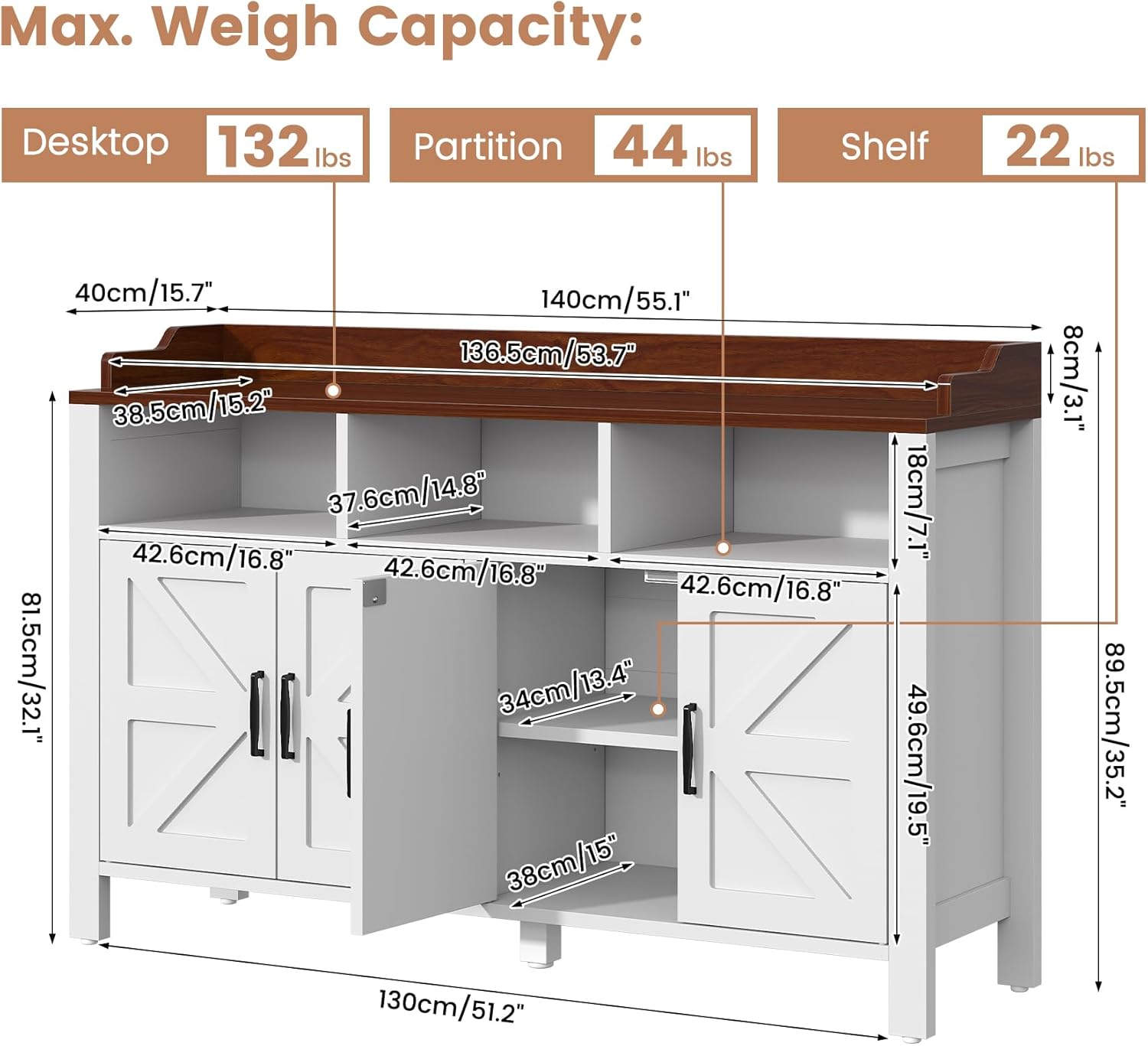 - 【Better Wood】Thicker and Denser Wood. The coffee bar cabinet with 3 open compartments and 4 barn doors is made from thicker MDF wood.The material with higher density is sturdier and smoother, largely reducing the likelihood of scratching, peeling and cracking.